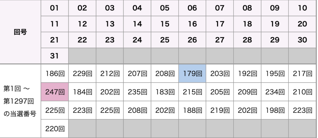 | 第1297回 2024-08-20(火) | 01 12 17 21 28 (31) |
