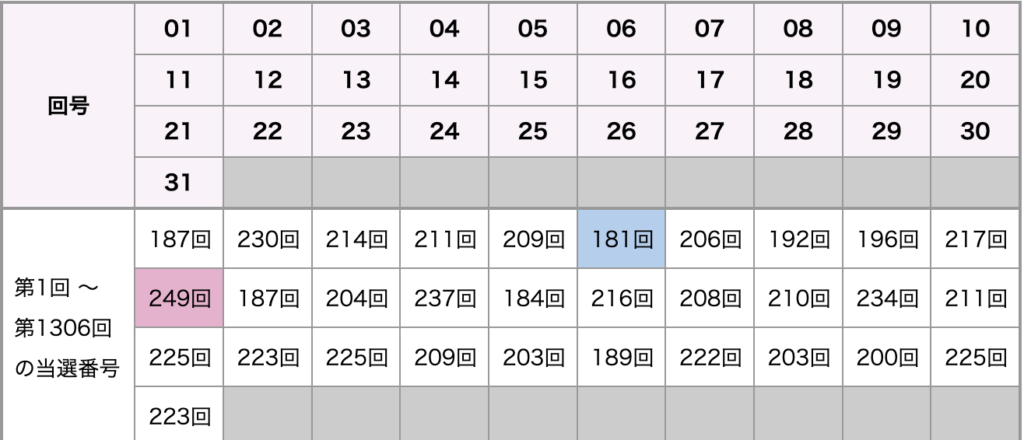 | 第1303回 2024-10-01(火) | 07 14 17 30 31 (22) |