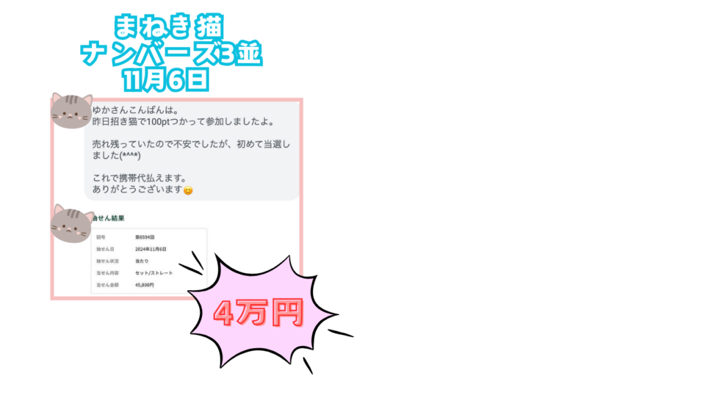 まねき猫_ミリオンドリーム_ミリオネア_百万石_宝くじ予想サイトで高額当選!2024年11月12日の参加プラン!ロト、ナンバーズ、予想、数字、無料!