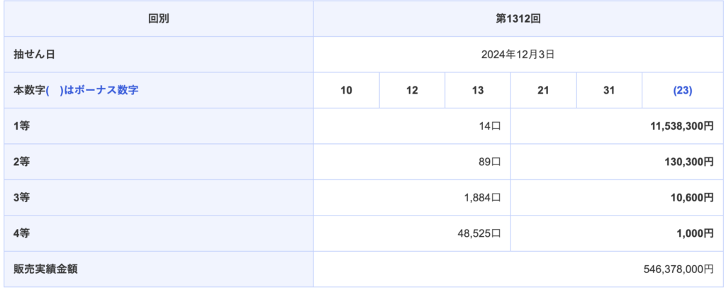 | 第1312回 2024-12-03(火) | 10 12 13 21 31 (23) |
