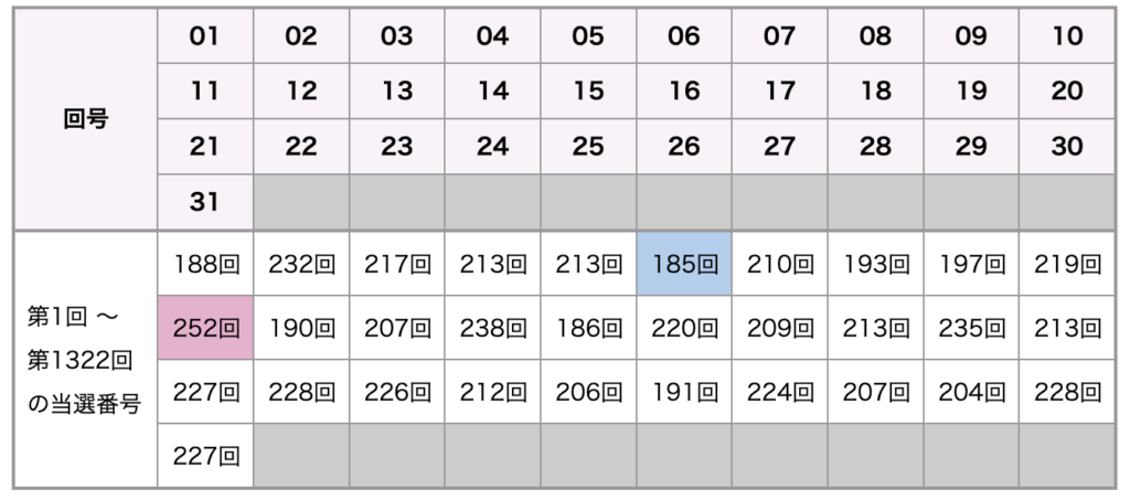 | 第1317回 2025-01-14(火) | 07 22 26 30 31 (11) |