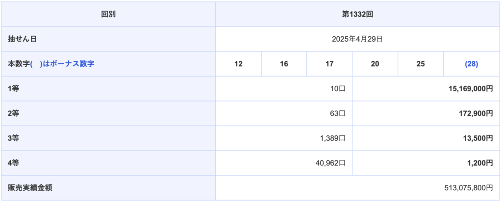 | 第1332回 2025-04-29(火) | 12 16 17 20 25 (28) |
