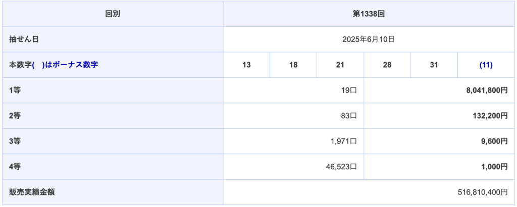 | 第1338回 2025-06-10(火) | 13 18 21 28 31 (11) |