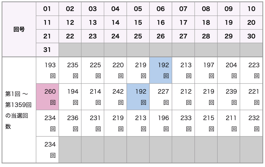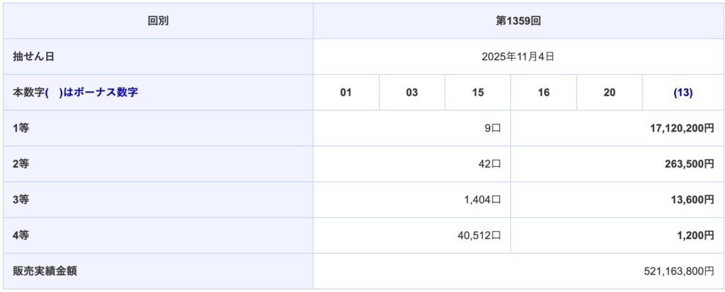 | 第1359回 2025-11-04(火) | 01 03 15 16 20 (13) |
