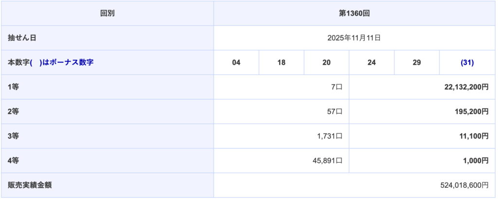 | 第1360回 2025-11-11(火) | 04 18 20 24 29 (31) |