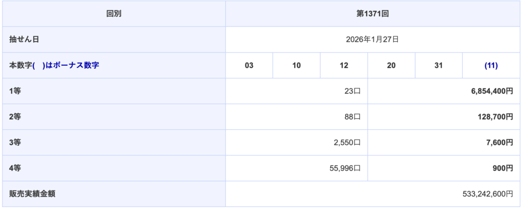 | 第1371回 2026-01-27(火) | 03 10 12 20 31 (11) |
