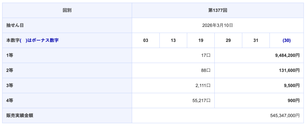 | 第1377回 2026-03-10(火) | 03 13 19 29 31 (30) |