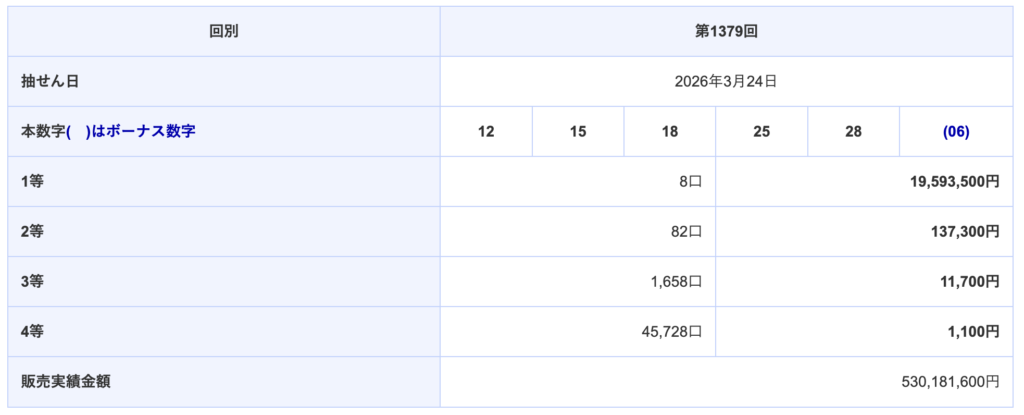 | 第1379回 2026-03-24(火) | 12 15 18 25 28 (06) |
